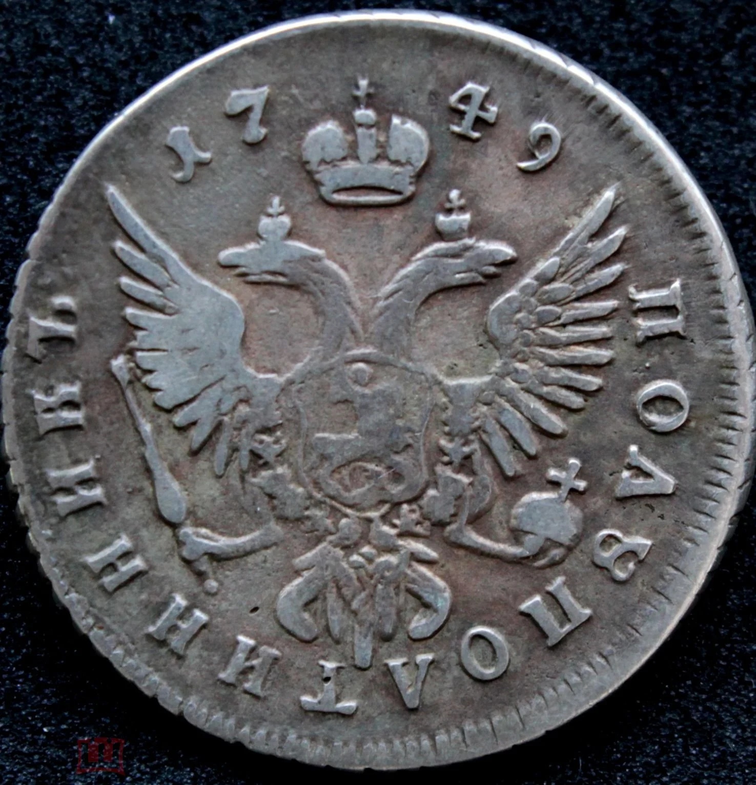 Полуполтинник (25 копеек) 1749 года чеканился в период правления императрицы Елизаветы Петровны из серебра. В посте автор прямо указывает, что монета является подделкой. Данный номинал в середине XVIII века был массовым, но часто подделывается в наше время.