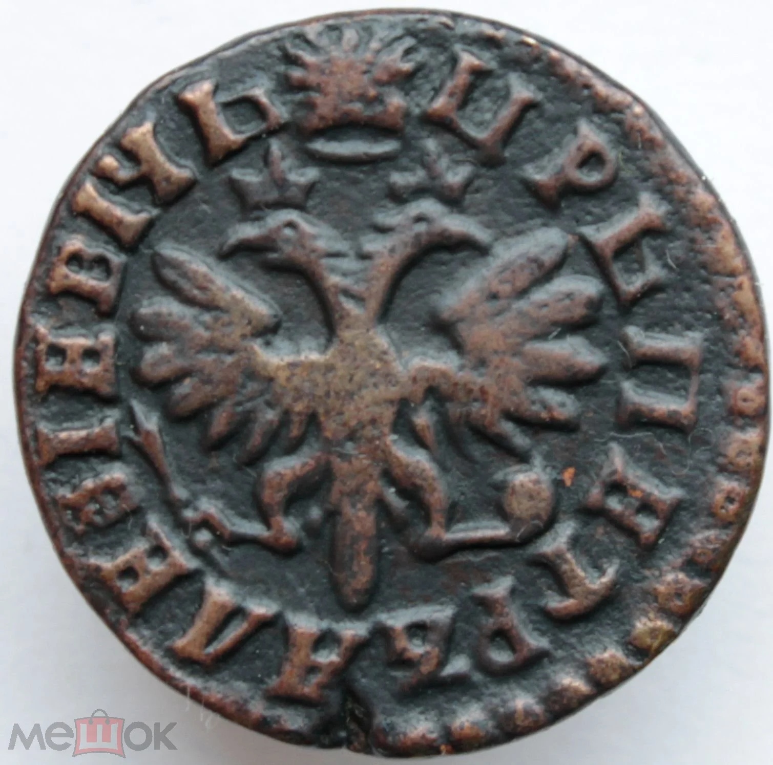Медная денга 1712 года, отчеканенная в период правления Петра I. В оригинале это монета раннего петровского чекана, однако представленный экземпляр является современной подделкой. Автор поста прямо указал на это, а отсутствие комментариев, опровергающих данное утверждение, лишь подтверждает вердикт.