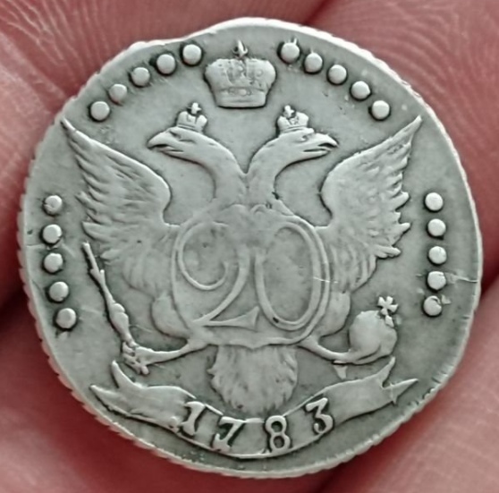 Монета номиналом 20 копеек 1783 года с монограммой Екатерины II и знаком Санкт-Петербургского монетного двора (СПБ). Относится к периоду правления императрицы, когда чеканились серебряные монеты с её вензелем. Владелец поста прямо указал, что это подделка, что является основным выводом.