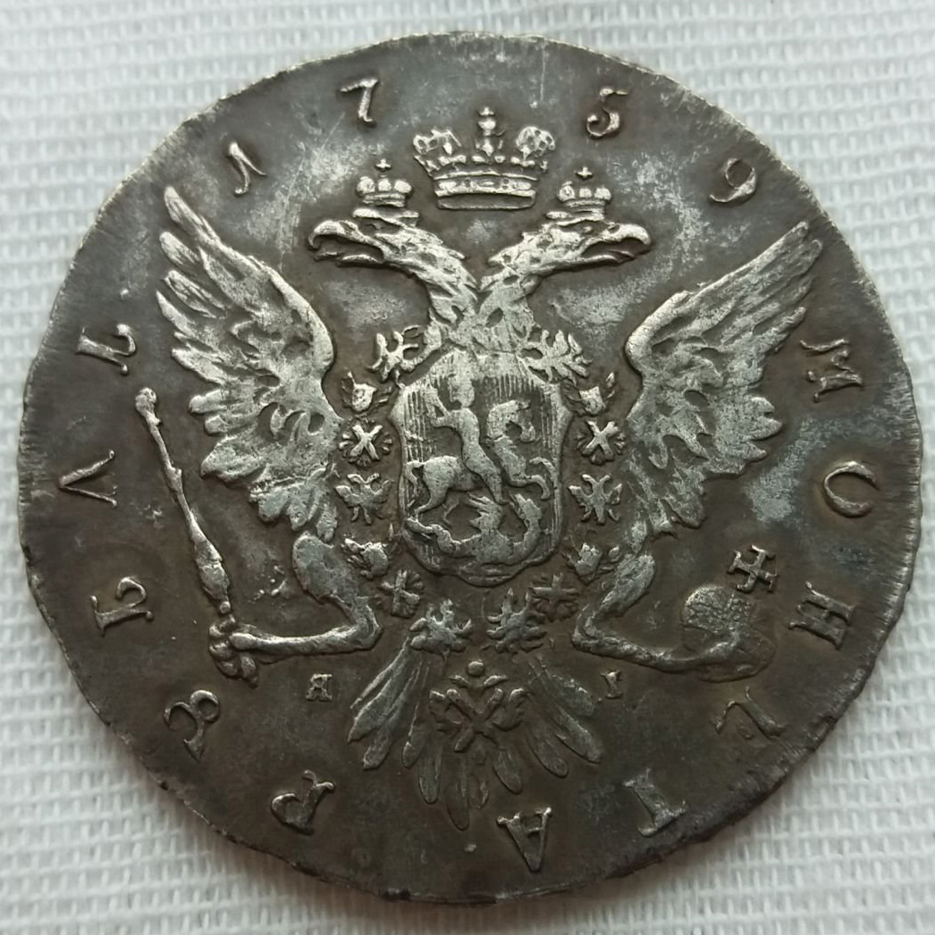 Монета представляет собой подделку серебряного рубля 1759 года, отчеканенного в период правления императрицы Елизаветы Петровны. Оригинальные рубли этого года имеют высокую коллекционную ценность и сложный портретный штемпель, что делает их частой мишенью для фальсификаторов. В самом посте автор прямо указывает, что монета является подделкой.