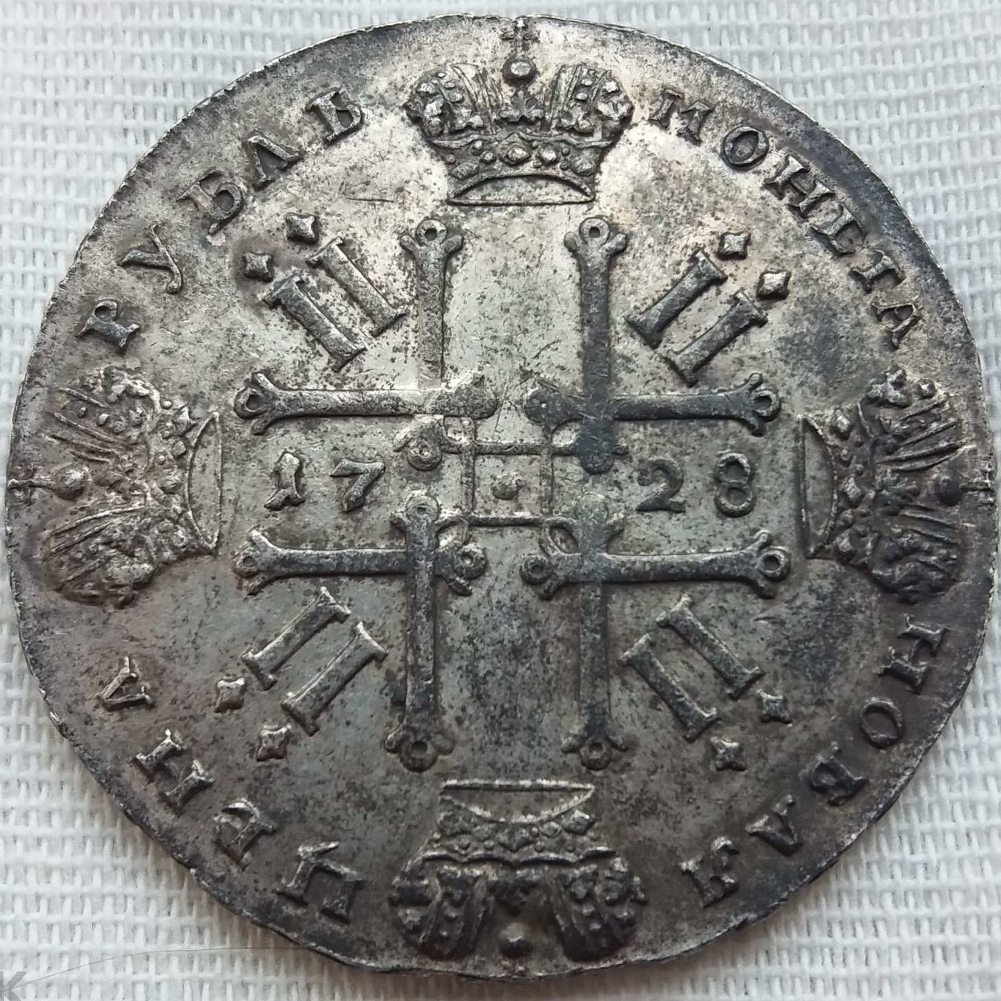 Монета представляет собой подделку рубля 1728 года, отчеканенного в правление императора Петра II. Оригинальные рубли этого года имеют высокую коллекционную ценность и сложны в исполнении, что делает их частой мишенью для фальсификаторов. Данный экземпляр, как указано в посте, является поддельным, что типично для рынка из-за спроса на редкие монеты этого периода.