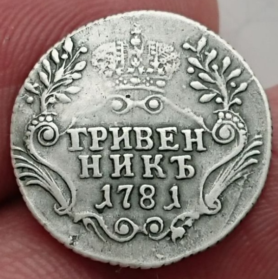 Монета представляет собой гривенник (10 копеек) времён правления Екатерины II, отчеканенный в 1781 году. Несмотря на внешнее сходство с оригинальными серебряными монетами того периода, данная монета является подделкой. Автор поста прямо указал на это, а отсутствие комментариев, опровергающих данный факт, лишь подтверждает вердикт.