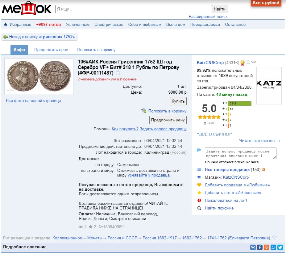 Монета представляет собой гривенник (10 копеек) 1752 года, отчеканенный в период правления императрицы Елизаветы Петровны. Оригинальные монеты этого типа изготавливались из серебра и имеют высокую коллекционную ценность. В данном случае, согласно автору поста, монета является подделкой, что делает её интересным объектом для изучения фальшивок.