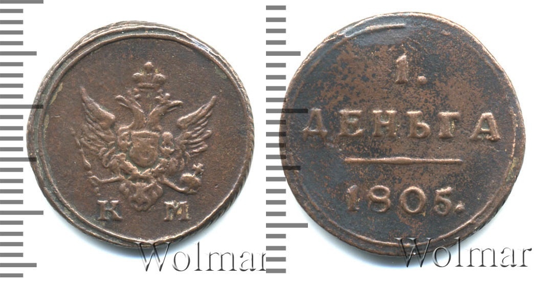 Монета представляет собой медную деньгу 1805 года, отчеканенную в правление императора Александра I. В оригинале такие монеты выпускались на Екатеринбургском монетном дворе (обозначение «ЕМ»). Однако представленный экземпляр является подделкой, о чём прямо указано в посте и подтверждается консенсусом в комментариях.
