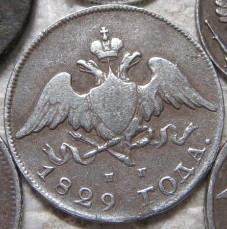 Монета номиналом 20 копеек, отчеканенная в 1829 году в период правления императора Николая I. Оригинальные монеты этого типа изготавливались из серебра 868-й пробы. В данном случае монета является подделкой, о чём прямо указано в описании поста.