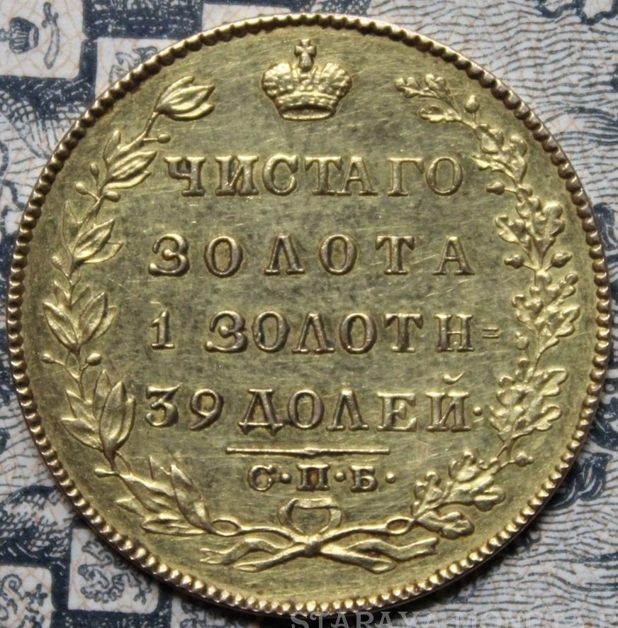 Монета представляет собой подделку золотых 5 рублей 1825 года, отчеканенных в Санкт-Петербурге при императоре Александре I. Оригинальные монеты этого типа чеканились в период с 1818 по 1825 год и являются коллекционной редкостью. В самом посте автор прямо указывает, что это подделка, что является основным атрибутом для определения.