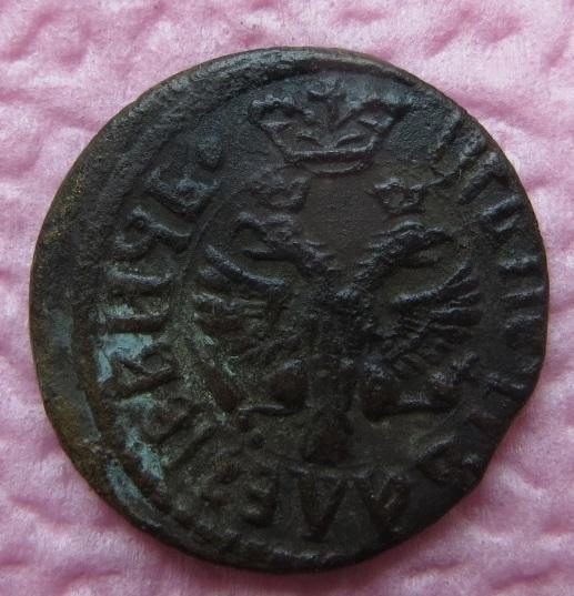 Медная полушка 1707 года, отчеканенная в период правления Петра I. Автор поста прямо указывает, что монета является подделкой. Подобные копии часто изготавливаются для коллекционеров, не знакомых с особенностями подлинных монет этого редкого типа.