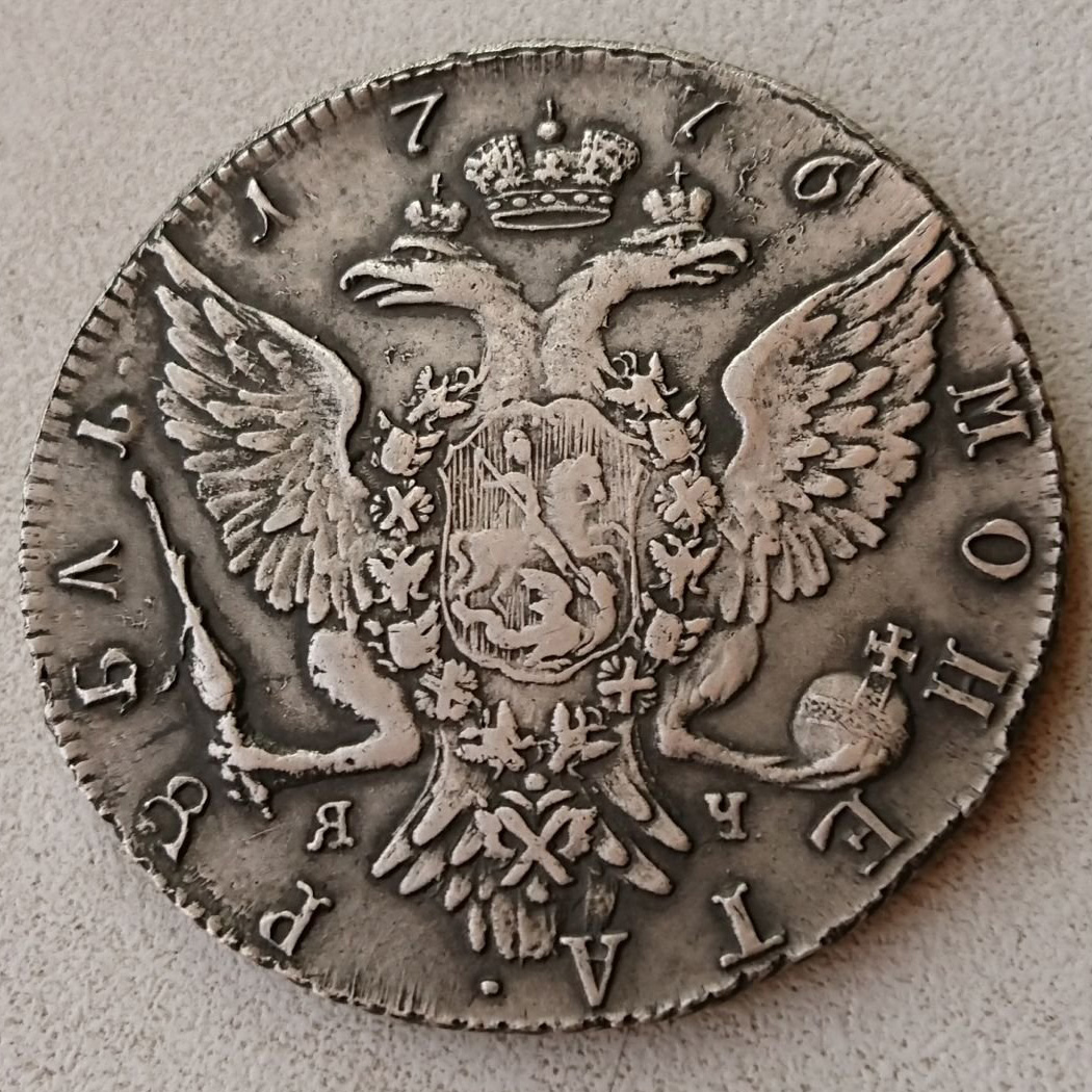 Монета представлена как серебряный рубль 1776 года периода правления Екатерины II с обозначением Санкт-Петербургского монетного двора (СПБ). Однако автор поста прямо указывает, что это подделка. Подобные копии часто изготавливаются для коллекционеров, не знакомых с оригиналом, и не имеют исторической и материальной ценности.