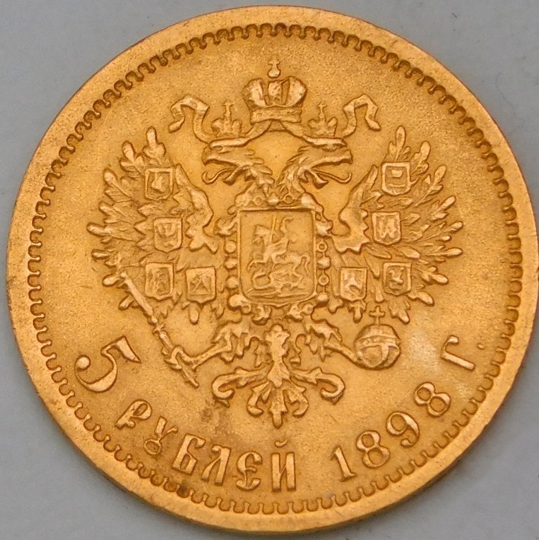 Монета номиналом 5 рублей 1898 года, отчеканенная в период правления императора Николая II. Оригинальные экземпляры изготавливались из золота 900-й пробы и имели высокую художественную детализацию. Представленный экземпляр является подделкой, о чём прямо указано в исходном посте.