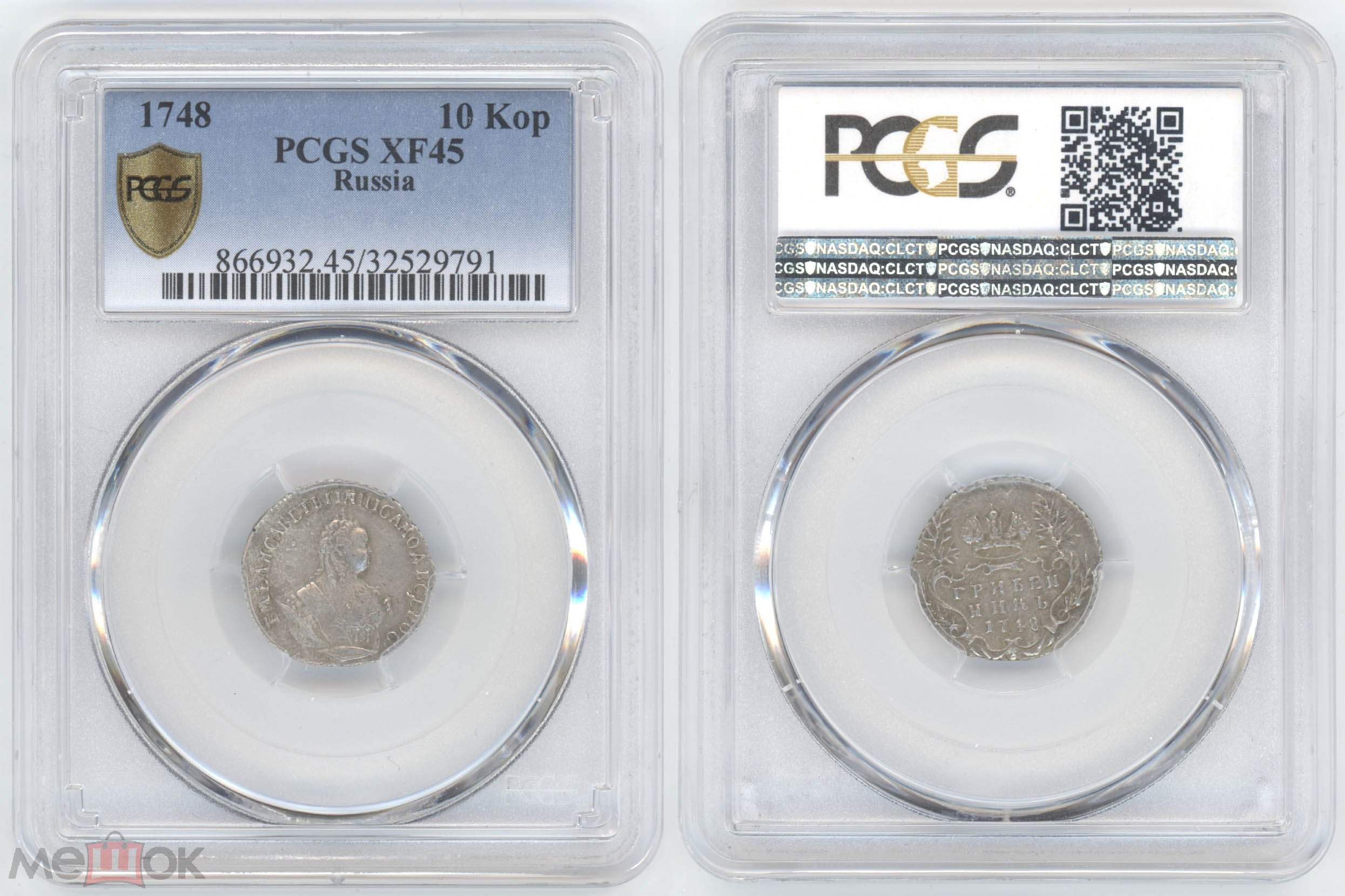 Монета представляет собой гривенник (10 копеек) времён правления императрицы Елизаветы Петровны, отчеканенный в 1748 году из серебра. Однако данная монета является современной подделкой, что подтверждается экспертами-нумизматами. Несмотря на попытку придать ей вид сертифицированного экземпляра, поместив в слаб PCGS, она не является оригиналом.