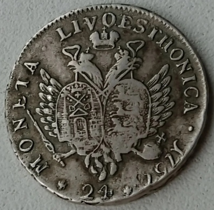 Монета 24 копейки (ливонез) 1757 года, отчеканенная в правление императрицы Елизаветы Петровны для Прибалтийских провинций. Данный экземпляр является подделкой, о чём прямо указано в описании поста. Подобные копии часто встречаются в продаже и не имеют коллекционной ценности.