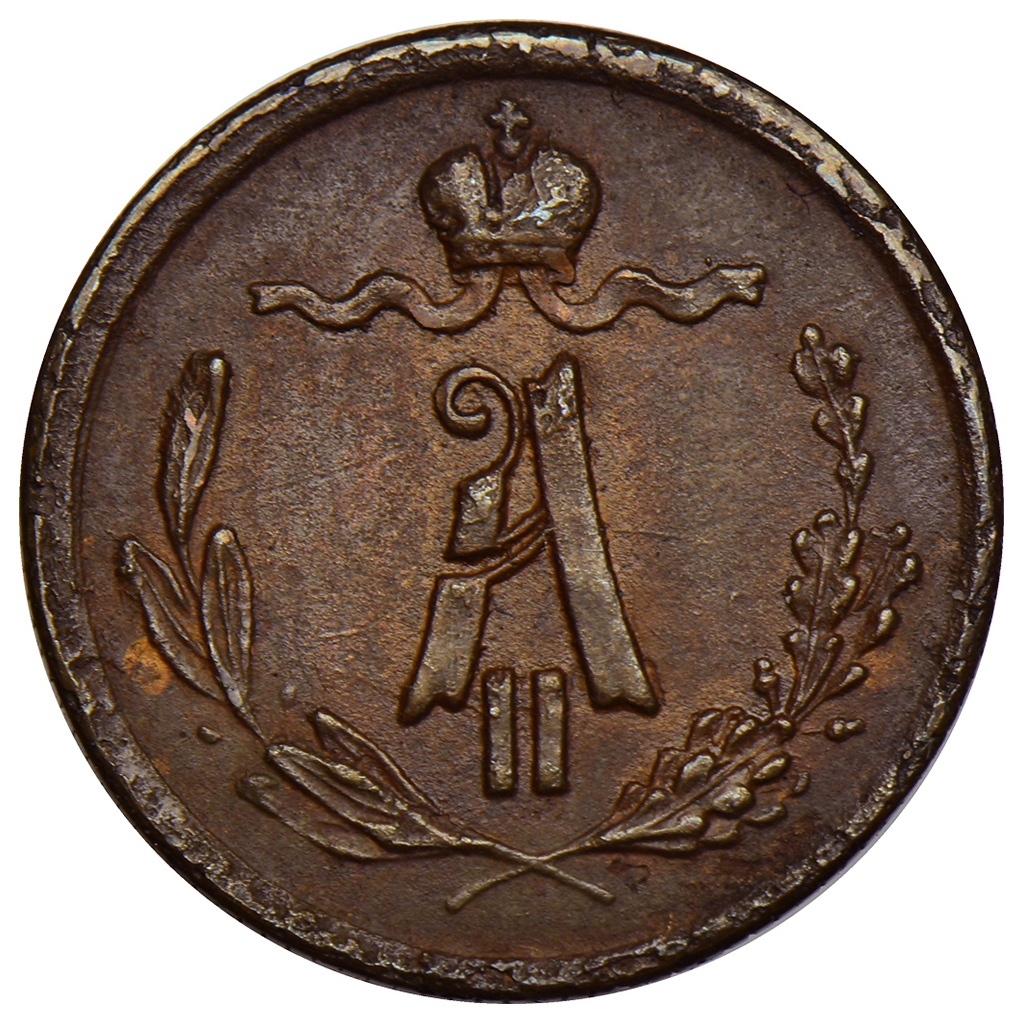 Монета представляет собой медную 1/4 копейки 1869 года с обозначением Санкт-Петербургского монетного двора (СПБ). В оригинале такие монеты чеканились в период правления Александра II и являются редкими. В данном случае, как указано в посте, это подделка, что делает её интересным объектом для изучения фальшивок.