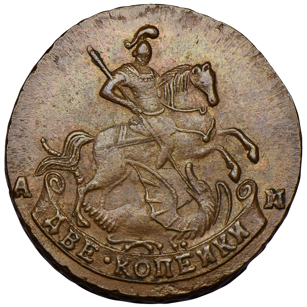 Монета номиналом 2 копейки 1790 года, отчеканенная в период правления Екатерины II. Это высококачественная подделка, изготовленная с использованием поддельных штемпелей на подлинной медной заготовке от монет 1757-1796 гг. Фальшивка представляет высокую опасность для коллекционеров, так как искусно имитирует оригинал.