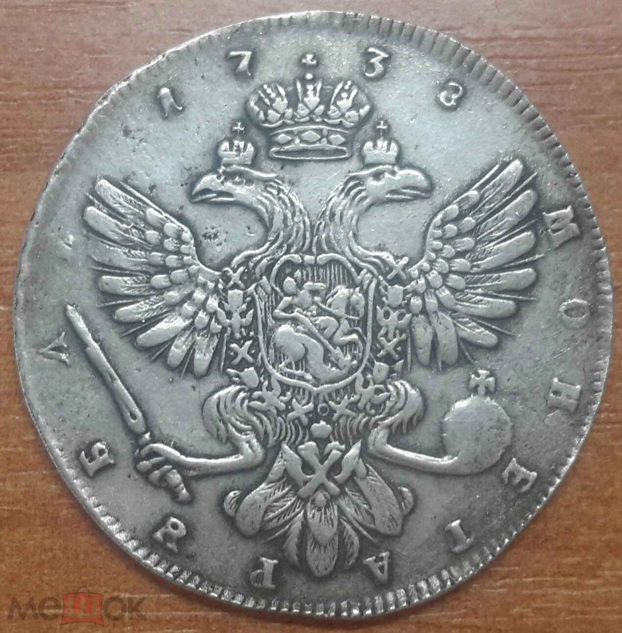 Монета представляет собой рубль 1738 года, отчеканенный при императрице Анне Иоанновна на Санкт-Петербургском монетном дворе (обозначение СПБ). В оригинале это серебряная монета, однако в данном случае автор поста прямо указывает, что это подделка. Подобные копии часто изготавливаются для коллекционеров, не желающих платить за дорогой оригинал.