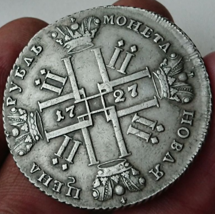 Монета представляет собой подделку рубля 1727 года, отчеканенного в период правления императрицы Екатерины I. Оригинальные рубли этого года имеют высокую коллекционную ценность и сложны в исполнении, что делает их частой мишенью для фальсификаторов. В данном случае автор поста прямо указывает, что монета является подделкой, что подтверждается консенсусом в комментариях.