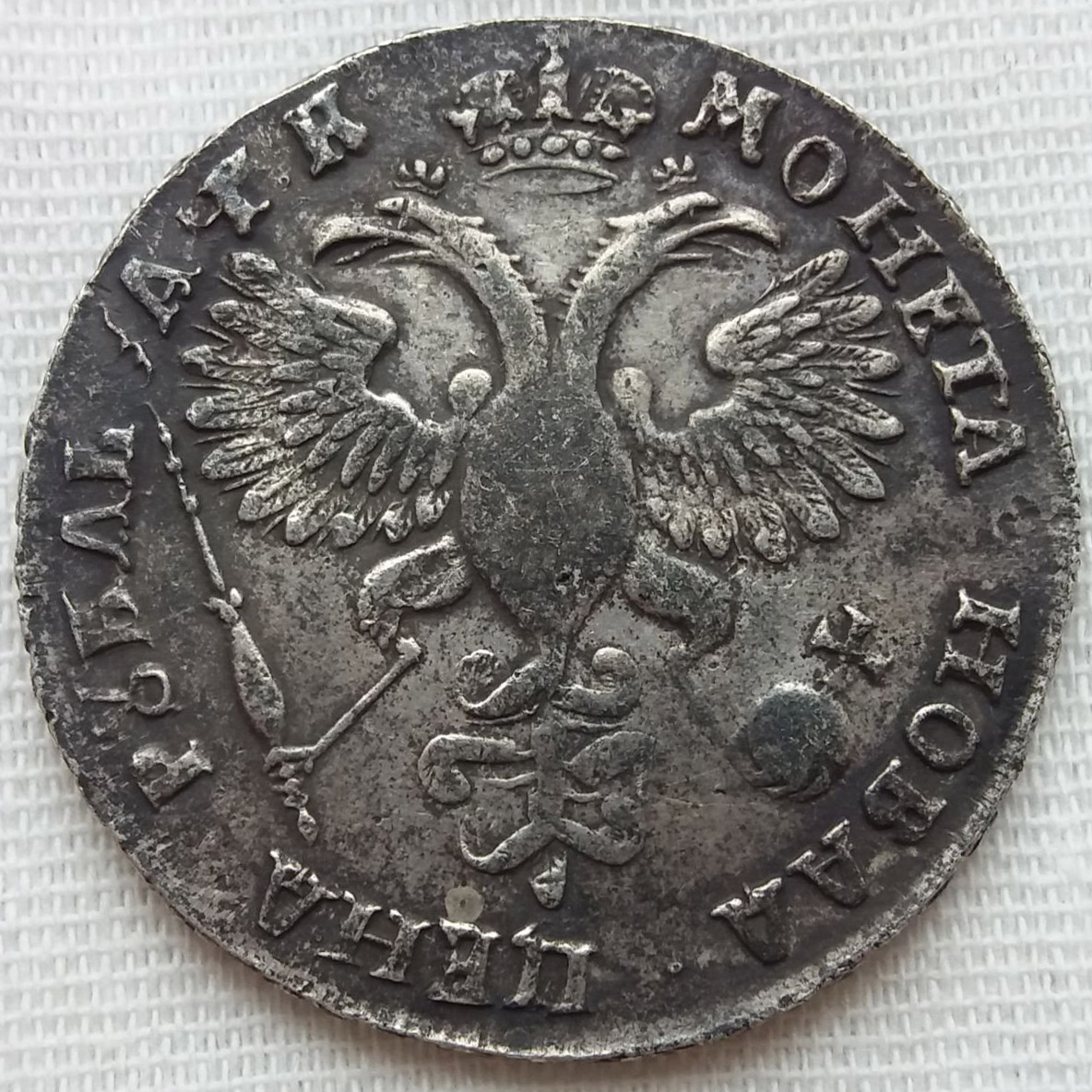 Монета представляет собой копию серебряного рубля 1720 года, отчеканенного в период правления Петра I. В оригинале это редкая и ценная монета, но представленный экземпляр является современной подделкой. Автор поста прямо указал на это в описании, что исключает вероятность оригинала.