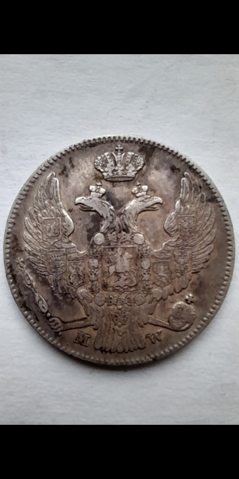 Серебряная монета номиналом 30 копеек / 2 злотых, отчеканенная в 1838 году в период правления императора Николая I. Монета предназначалась для обращения в Царстве Польском, входившем в состав Российской Империи. Судя по консенсусу в комментариях экспертов, представленный экземпляр является подлинным.