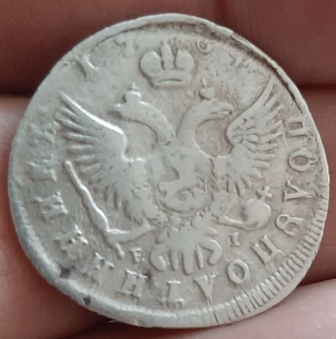 Полуполтинник (25 копеек) 1754 года, отчеканенный на Московском монетном дворе (ММД) в период правления императрицы Елизаветы Петровны. Оригинальные монеты этого типа изготавливались из серебра 802-й пробы. В данном случае монета является подделкой, о чём прямо указано в описании поста.