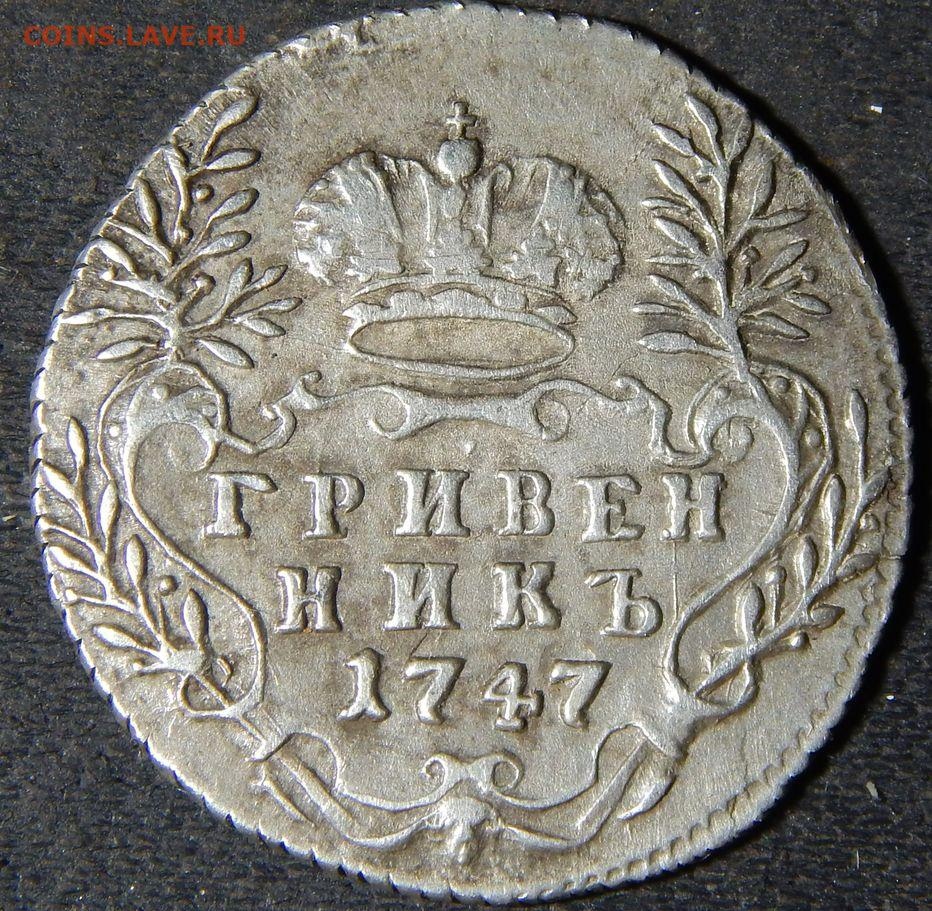 Монета представляет собой гривенник (10 копеек) 1747 года, отчеканенный в период правления императрицы Елизаветы Петровны из серебра. В оригинале это популярная у коллекционеров монета, однако представленный экземпляр является подделкой. Автор поста прямо указал на это, а комментарий косвенно подтверждает сомнения в подлинности, прося сравнение с оригиналом.