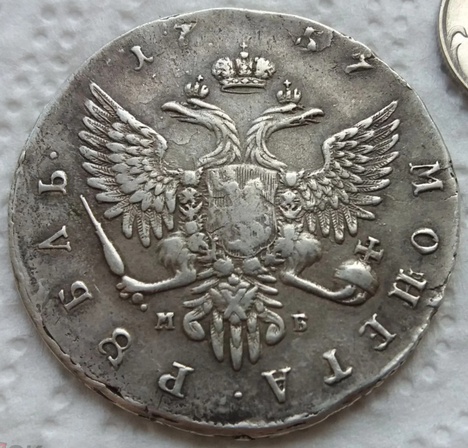 Монета представляет собой подделку серебряного рубля 1757 года, отчеканенного при императрице Елизавете Петровне на Московском монетном дворе (ММД). Оригинальные монеты этого типа высоко ценятся коллекционерами, что делает их частой мишенью для фальсификаторов. В данном случае автор поста прямо указывает на поддельность, а вес в 22.81 грамма, указанный в комментариях, является критически низким для подлинного тяжелого серебряного рубля елизаветинского времени.