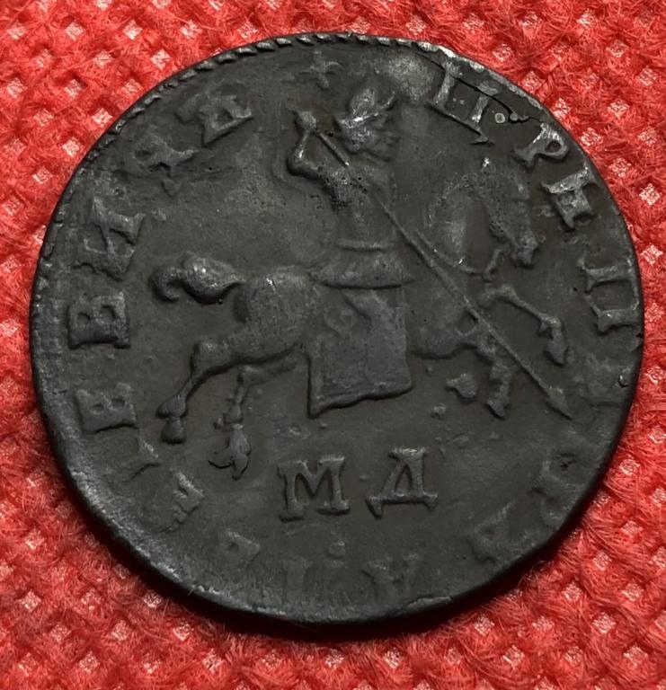 Медная копейка 1710 года, отчеканенная при Петре I. Монета периода денежной реформы, когда чеканились крупные копейки-чешуйки неправильной формы. Представленный экземпляр является подделкой, о чём прямо указано в описании поста.