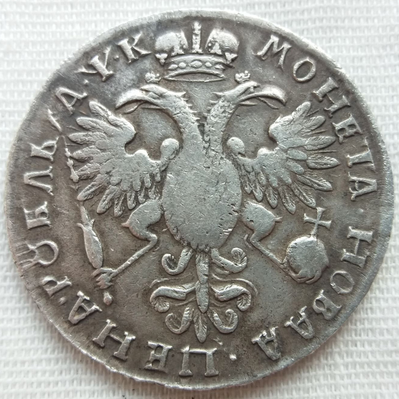 Монета представляет собой копию серебряного рубля 1720 года, отчеканенного в период правления Петра I. Оригинальные рубли этого года имеют высокую коллекционную ценность и сложны в исполнении. В посте автор прямо указывает, что это подделка, что является основным атрибутом данного экземпляра.