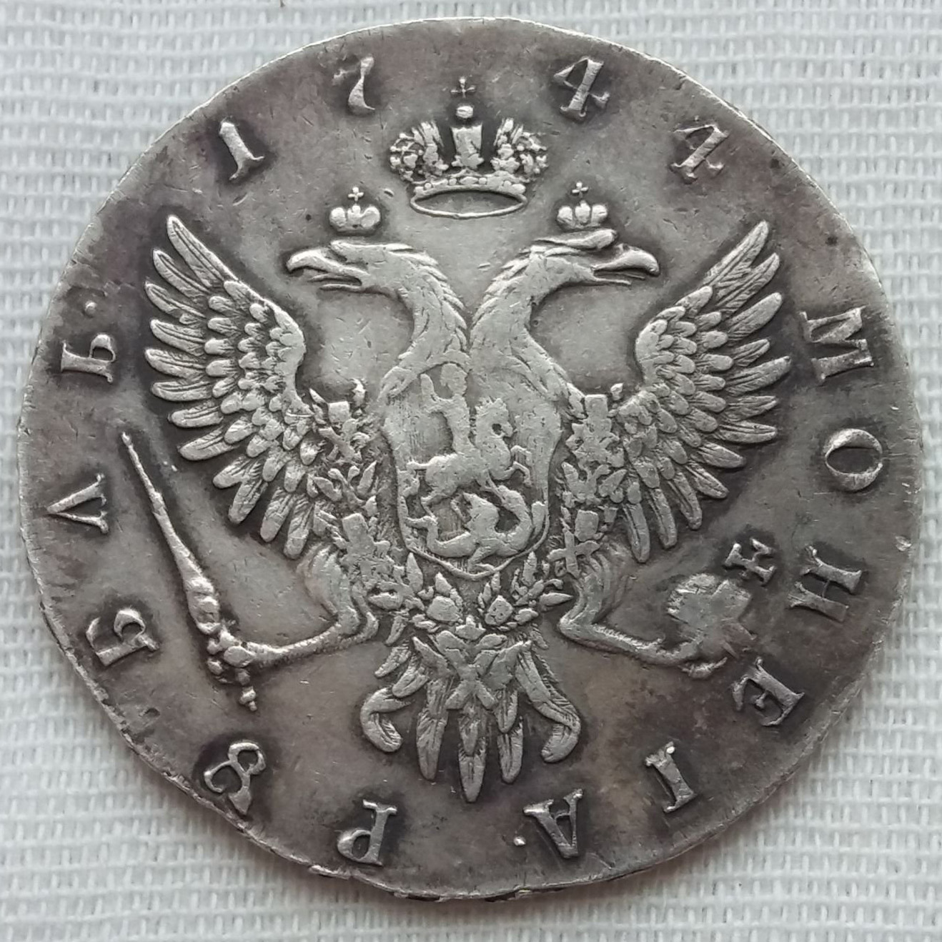 Монета представляет собой копию серебряного рубля 1744 года, отчеканенного при императрице Елизавете Петровне на Московском монетном дворе (ММД). Оригинальные экземпляры этого года являются редкими и ценными. В данном случае, как прямо указано в посте, это подделка, созданная для обмана коллекционеров или в качестве сувенира.