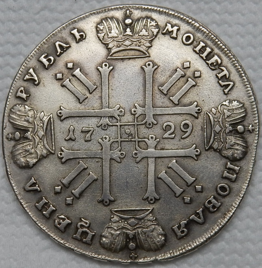 Монета номиналом 1 рубль, отчеканенная в 1729 году от имени императора Петра II. Оригинальные рубли этого года являются большой редкостью. Представленный экземпляр — откровенная подделка, что очевидно даже по низкокачественным фотографиям.