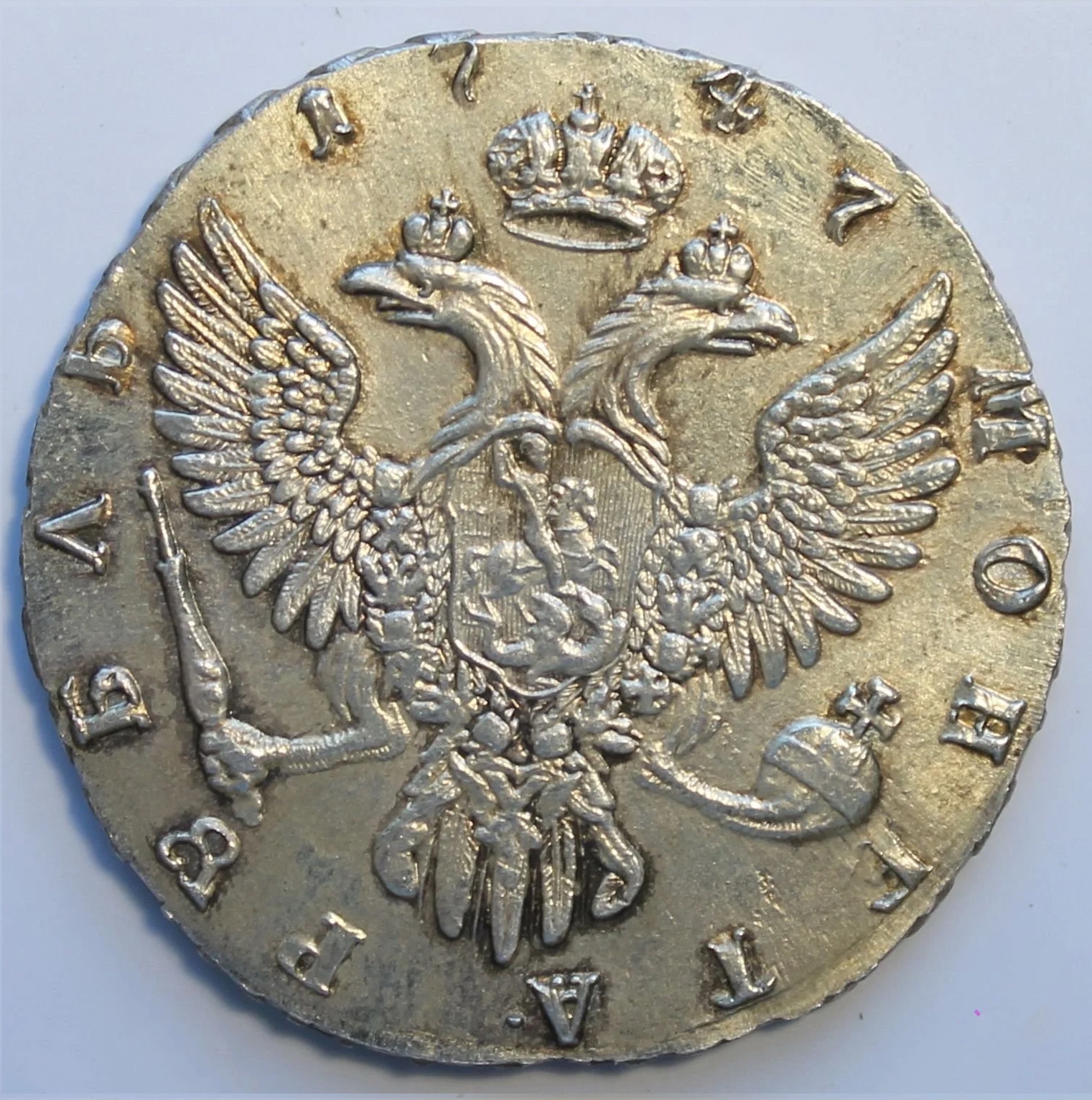 Монета представляет собой копию серебряного рубля 1747 года, отчеканенного в правление императрицы Елизаветы Петровны. Оригинальные рубли этого года имеют высокую коллекционную ценность и встречаются редко. Данный экземпляр является современной репликой, о чём прямо указано в описании поста.