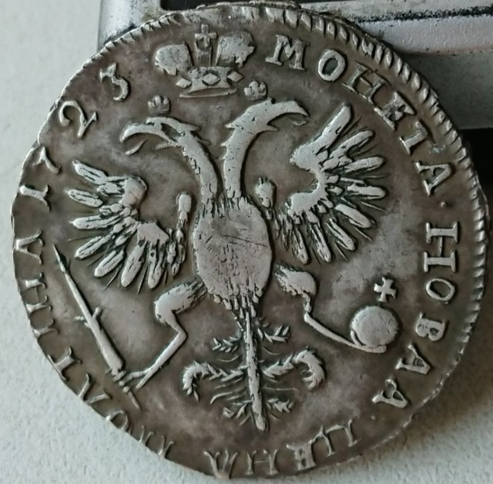Монета представляет собой подделку полтины 1723 года, отчеканенной в правление Петра I. Оригинальные монеты этого периода имеют высокий уровень детализации портрета и герба. Данный экземпляр является грубой копией, о чём свидетельствует ироничный комментарий сообщества.