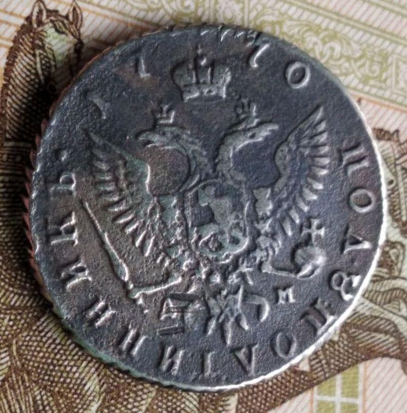 Монета представляет собой полуполтинник (25 копеек) периода правления Емператрицы Екатерины II, отчеканенный на Московском монетном дворе (ММД) в 1770 году. Данный экземпляр является подделкой, о чём прямо указано в описании поста. Подобные копии часто изготавливаются для коллекционеров, не знакомых с подлинными характеристиками монет.