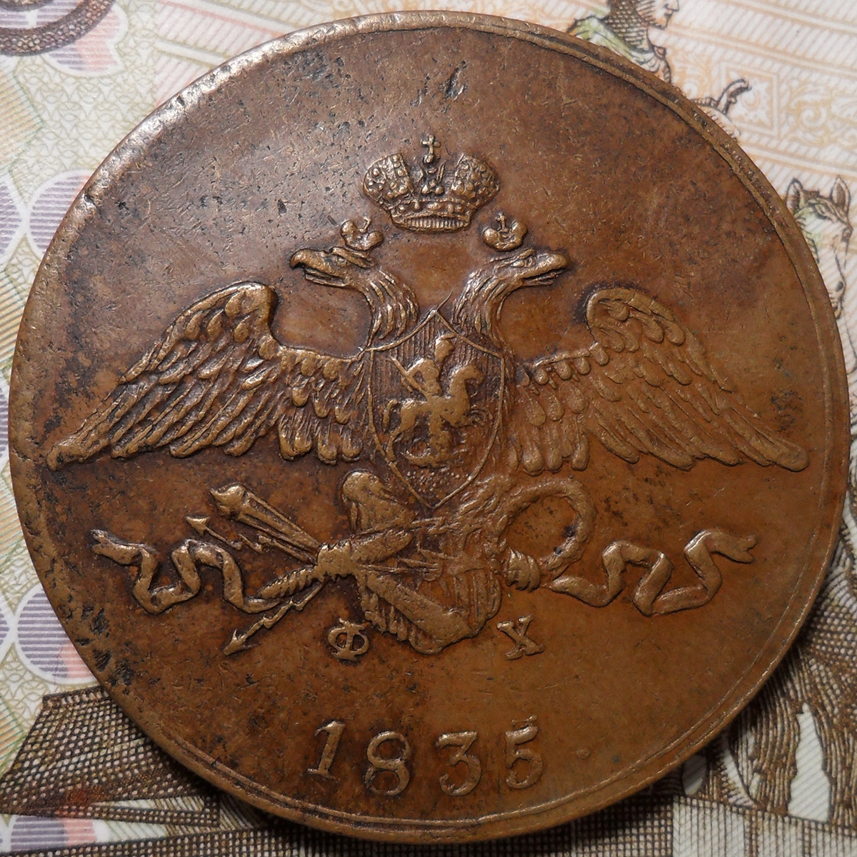 Медная монета 5 копеек 1835 года, отчеканенная на Екатеринбургском монетном дворе (инициалы минцмейстера Ф. Хвощинского — ЕМ-ФХ). Данный экземпляр является искусной, но опасной подделкой, способной ввести в заблуждение неопытных коллекционеров. Критику вызвали неестественный цвет металла, неидеальное качество чеканки и неровности в написании легенды, в частности, слова "КОПЪЕКЪ".
