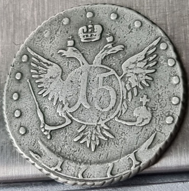 Монета номиналом 15 копеек 1771 года, отчеканенная в период правления императрицы Екатерины II из серебра. В оригинале это достаточно редкая и ценная монета, однако представленный экземпляр является фейком, о чём прямо указано в описании поста. Подобные копии часто изготавливаются для обмана коллекционеров.