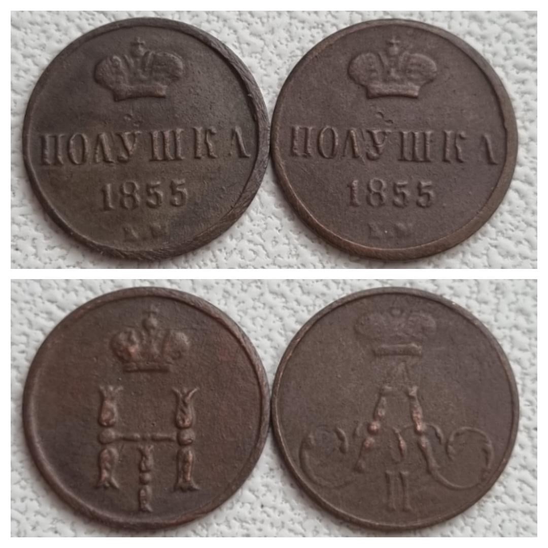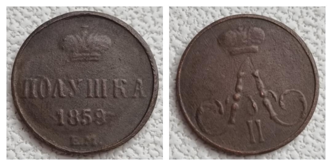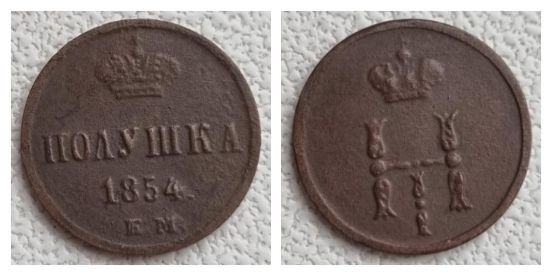 Представленная монета — медная полушка периода правления Николая I, предположительно 1855 года выпуска. Это распространённая подделка, отлитая для обмана начинающих коллекционеров. Фейк выдают одинаковый нехарактерный вес для всех экземпляров (1.1-1.2 г) и идентичные детали реверса у монет разных лет, что невозможно для оригинальной чеканки.
