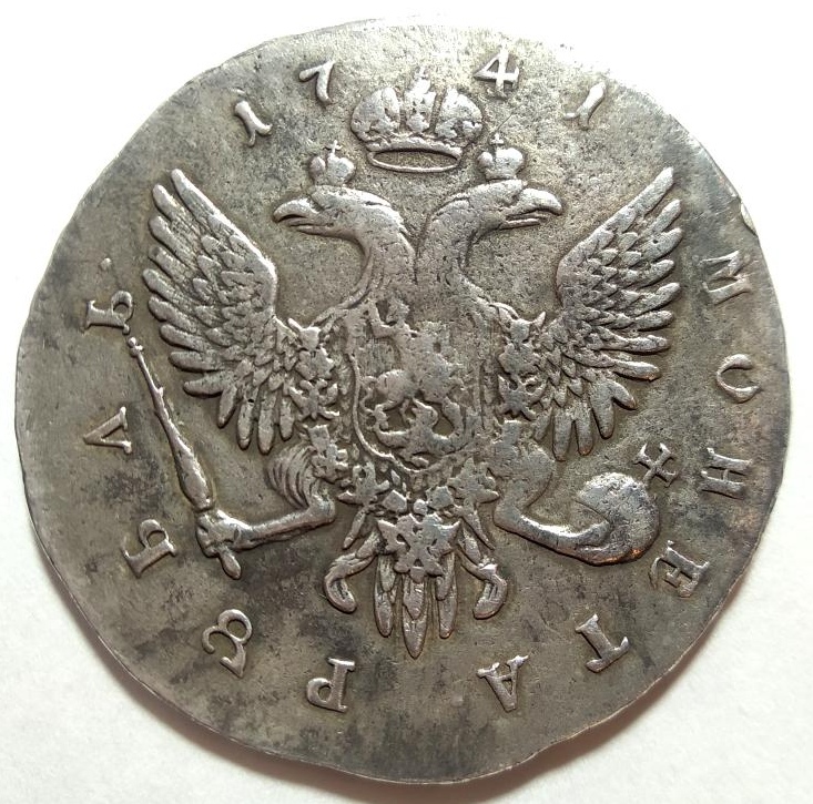 Монета представляет собой рубль 1741 года, отчеканенный в Санкт-Петербурге в период правления императрицы Елизаветы Петровны. Оригинальные монеты этого типа изготавливались из серебра и имеют высокую коллекционную ценность. В данном случае автор поста прямо указывает, что это подделка.