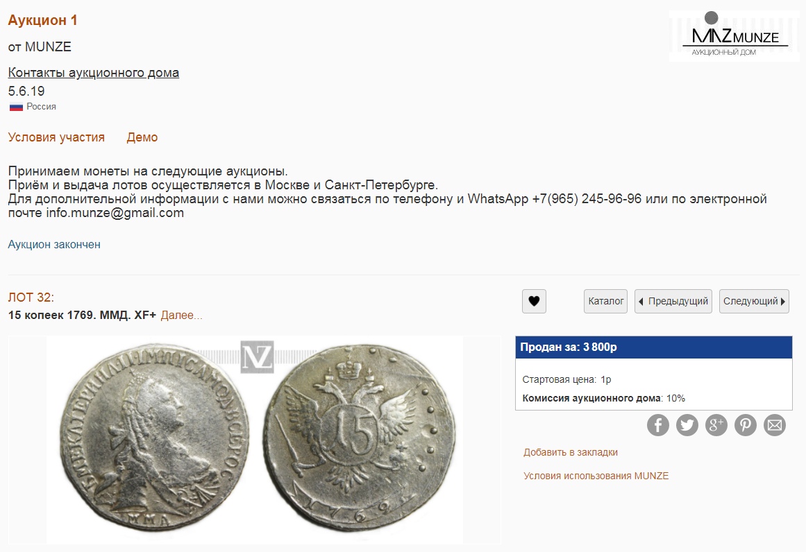 15 копеек 1769 года ММД — поддельная монета Екатерины II