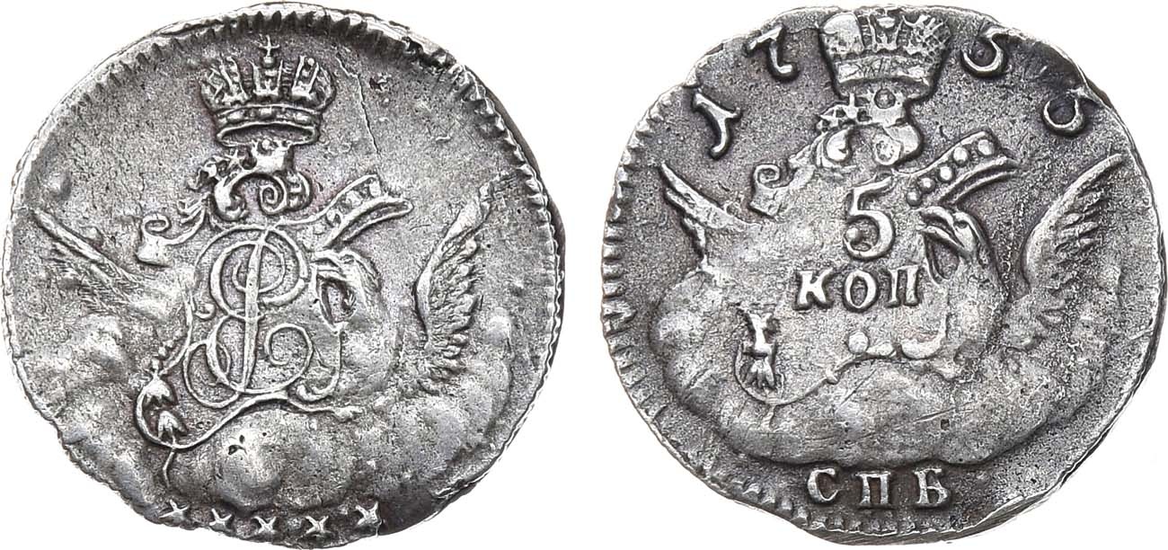5 копеек 1755 года СПБ — поддельная монета Елизаветы Петровны