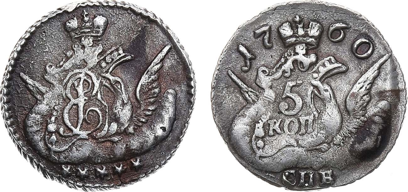 5 копеек 1760 года СПБ — поддельная монета Российской Империи