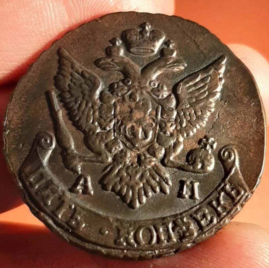 Монета номиналом 5 копеек 1796 года с вензелем Екатерины II (ЕМ) является копией. Оригинальные монеты этого типа чеканились на Екатеринбургском монетном дворе в последний год правления императрицы. Представленный экземпляр, как указано в посте, является репликой, что подтверждается консенсусом в комментариях.