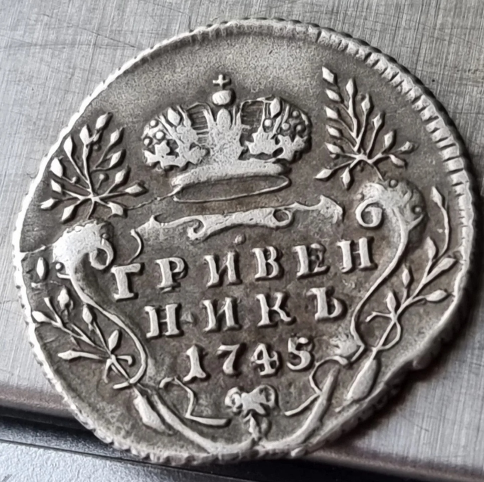 Монета представляет собой гривенник (10 копеек) 1745 года, отчеканенный в период правления императрицы Елизаветы Петровны. Оригинальные монеты этого типа чеканились из серебра и имеют высокую коллекционную ценность. Представленный экземпляр является копией, о чём прямо указано в описании поста.