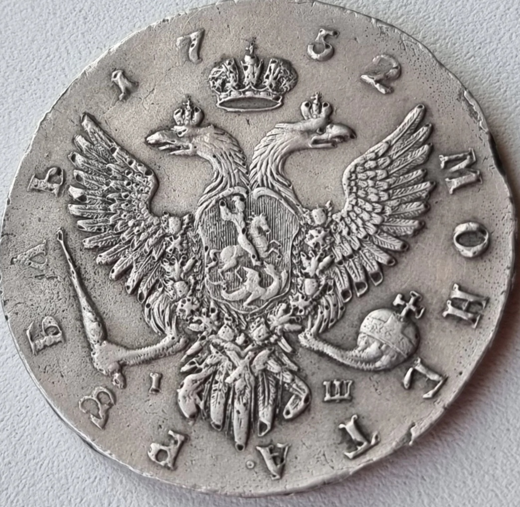 Монета представляет собой подделку серебряного рубля 1752 года, отчеканенного при императрице Елизавете Петровне на Московском монетном дворе (ММД). Оригинальные рубли этого периода имеют высокую коллекционную ценность и часто становятся мишенями для фальсификаторов. В данном случае автор поста прямо указывает, что монета является поддельной.