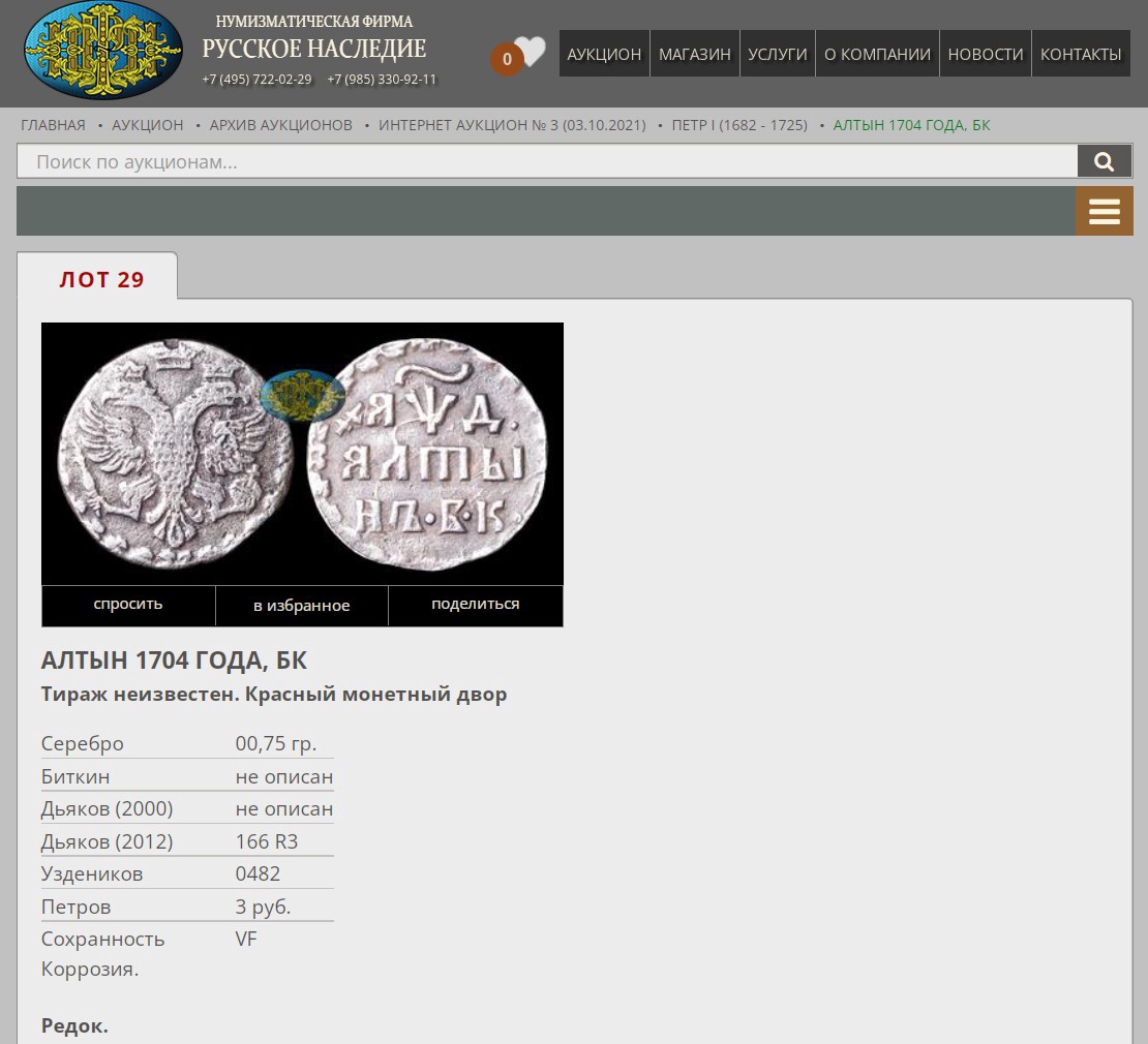 Алтын 1704 года Петра I — современная подделка