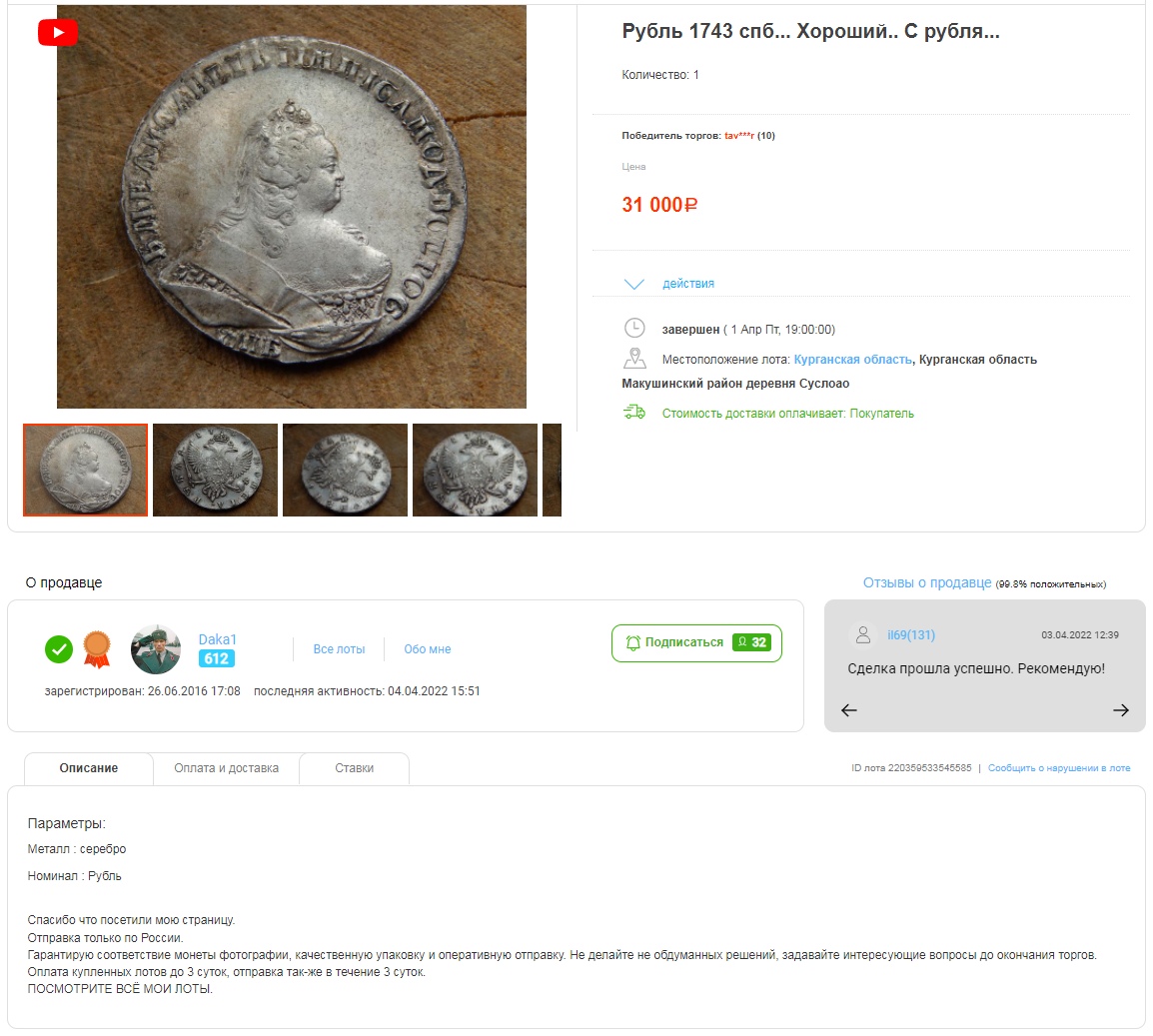 Монета представляет собой подделку серебряного рубля 1743 года, отчеканенного при императрице Елизавете Петровне на Санкт-Петербургском монетном дворе (обозначение СПБ). Оригинальные рубли этого периода имеют высокую коллекционную ценность, что делает их частой мишенью для фальсификаторов. В данном случае автор поста прямо указывает, что монета является подделкой.
