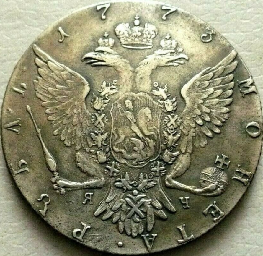 Монета представляет собой копию серебряного рубля 1773 года, отчеканенного при Екатерине II на Санкт-Петербургском монетном дворе (обозначение СПБ). В оригинале это крупная и ценная монета из высокопробного серебра. В посте автор прямо указывает, что это копия, что делает её сувенирным или фальшивым экземпляром, не имеющим нумизматической ценности.