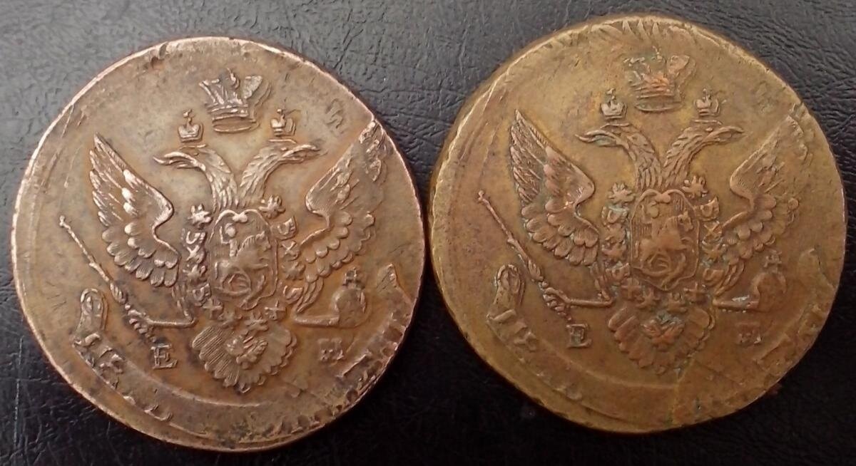 Медная монета номиналом 5 копеек 1796 года, отчеканенная на Екатеринбургском монетном дворе (обозначение «ЕМ») в правление Екатерины II. Монета периода сдвоенных инициалов минцмейстеров П. П. (Павел Панасенков). В посте автор прямо указывает, что это подделка, что является распространённой практикой для данной монеты, часто подделываемой из-за спроса коллекционеров.
