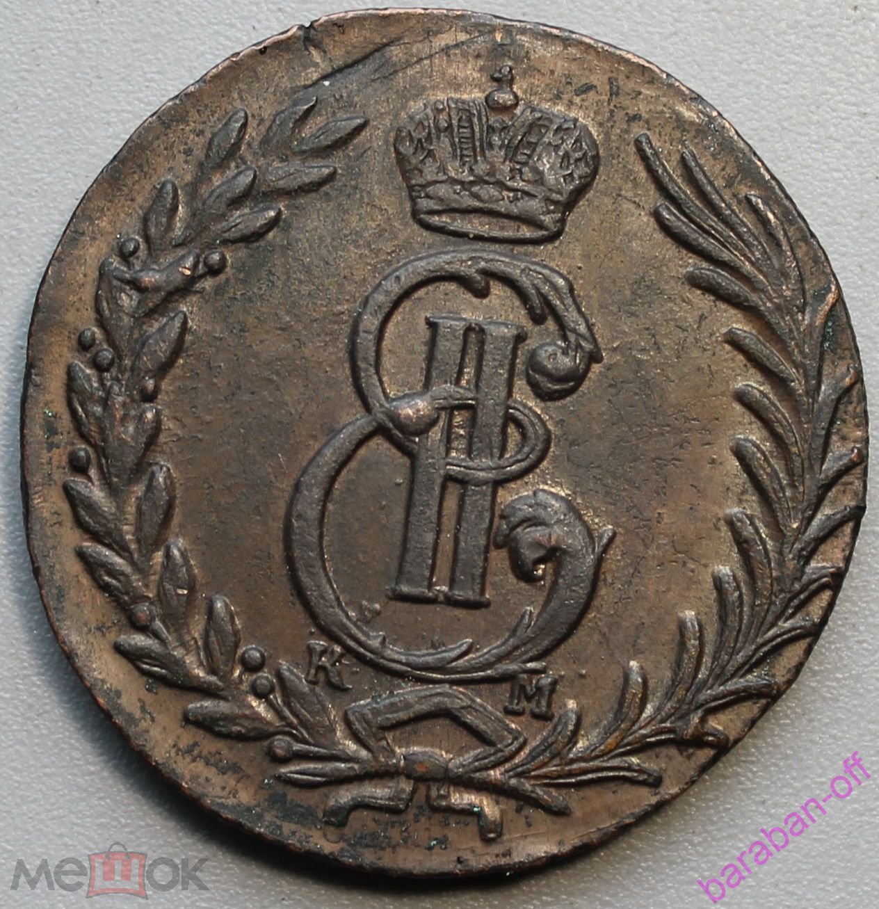 Монета представляет собой копию медных 5 копеек периода правления Емператрицы Екатерины II, отчеканенных в 1777 году. Оригинальные монеты этого типа чеканились на Санкт-Петербургском монетном дворе и имеют высокую коллекционную ценность. Данный экземпляр является современной репликой, о чём прямо указано в описании поста.