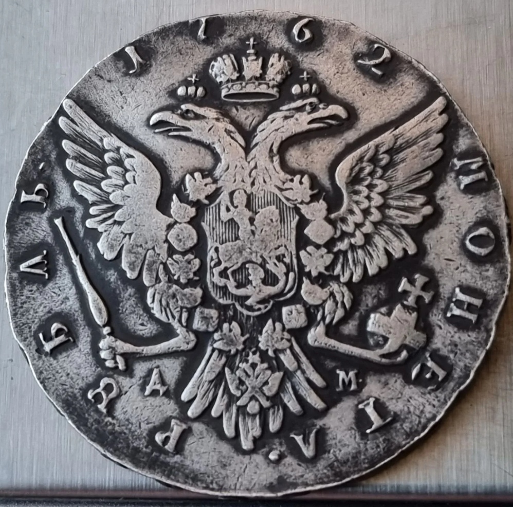 Монета представляет собой копию серебряного рубля 1762 года, отчеканенного в период короткого правления императора Петра III. Оригинальные монеты этого типа имеют высокую историческую и коллекционную ценность. В посте прямо указано, что это копия, что делает её непригодной для серьёзной коллекции подлинников.