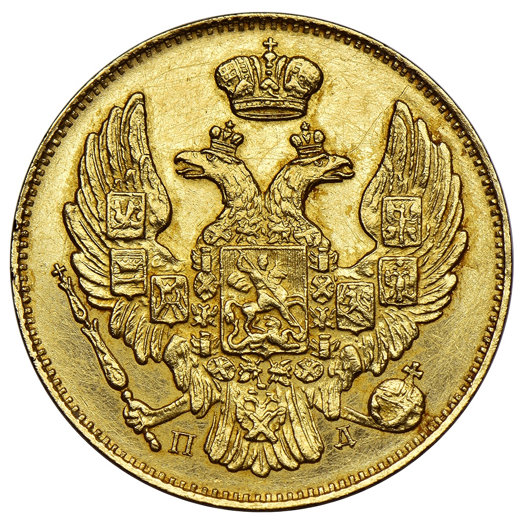 Монета 3 рубля — 20 злотых 1835 года (СПБ) отчеканена в период правления Николая I для Царства Польского. Это опасная высококачественная подделка, массово появившаяся на рынке после 2012 года. Её вес (3.92 г) и диаметр (около 19 мм) близки к оригиналу, но детали чеканки выдают фальшивку, которая даже попадала в слабы авторитетных грейдинговых компаний.