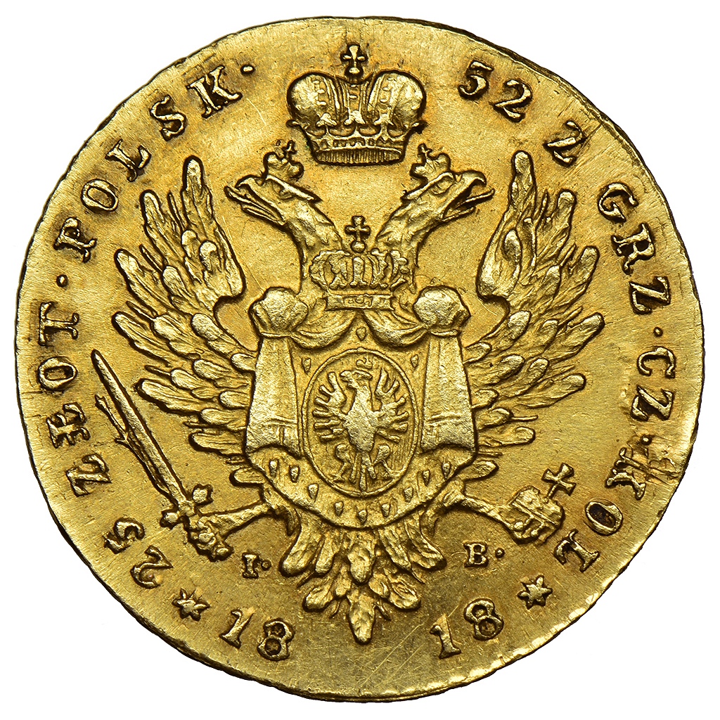 Монета 25 злотых 1818 года чеканилась для Царства Польского в период правления императора Александра I. Это золотая монета, имеющая высокую коллекционную ценность. Представленный экземпляр является современной подделкой, о чём прямо указано в посте и подтверждается её регистрацией в базе фальшивок.