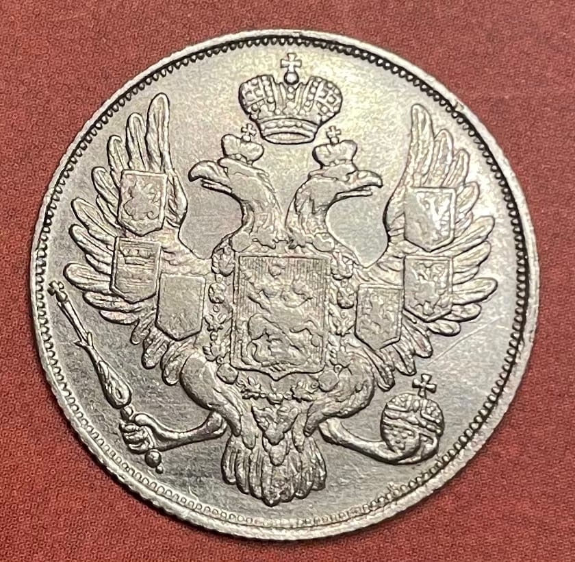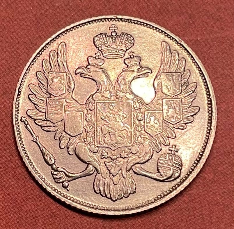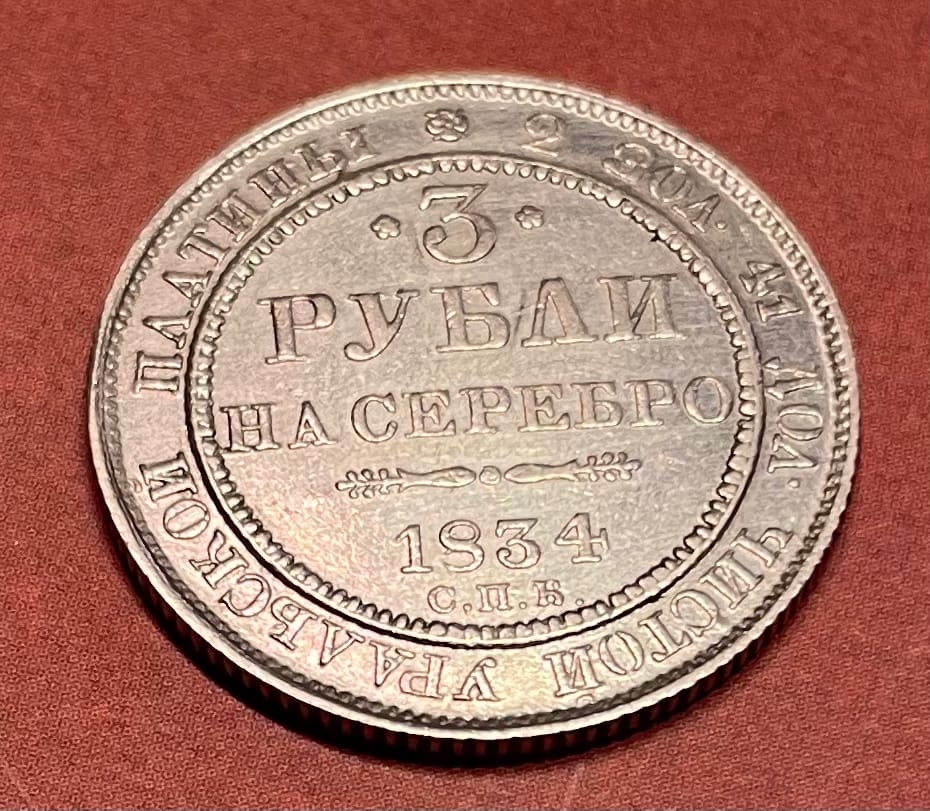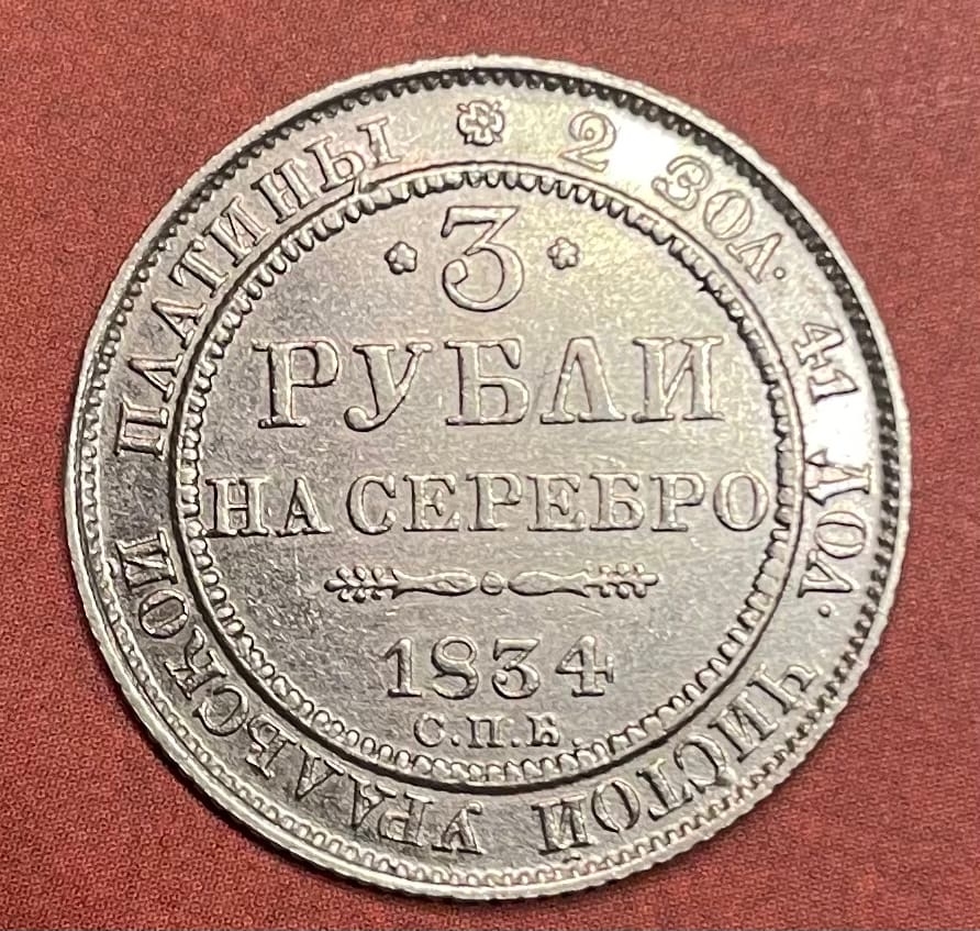Монета 3 рубля 1834 года, отчеканенная при Николае I из серебра. Данный номинал является редким и коллекционно значимым. На основе предоставленных данных и отсутствия экспертных комментариев однозначно определить подлинность не представляется возможным.
